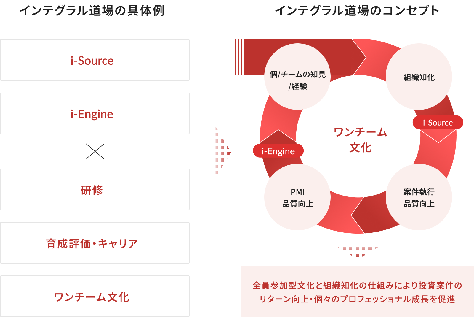 私たちは、「インテグラル道場」という独自の人材育成プログラムを通じて、専門性や知見に加え、人間性や共感性を兼ね備えた個人を育て、さらに、そのような個人が団結して社会価値の創造と投資リターンを追求するプロフェッショナル集団の構築を目指しています。